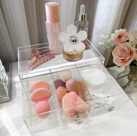 - Removable tray has 4 slot cuts. 1 for a beauty blender, 2 for larger powder puffs, 1 for a smaller finger puff